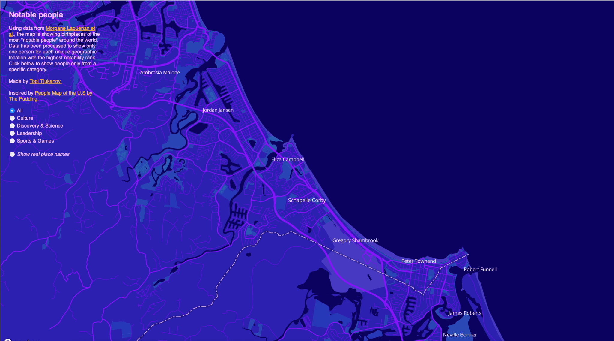 Where are the most notable people on the planet from? This really cool mashup of Wikidata and Openmaps shows you, on a globe. Looks like I've got to do something pretty notable to knock my local celebrity off her mantle.