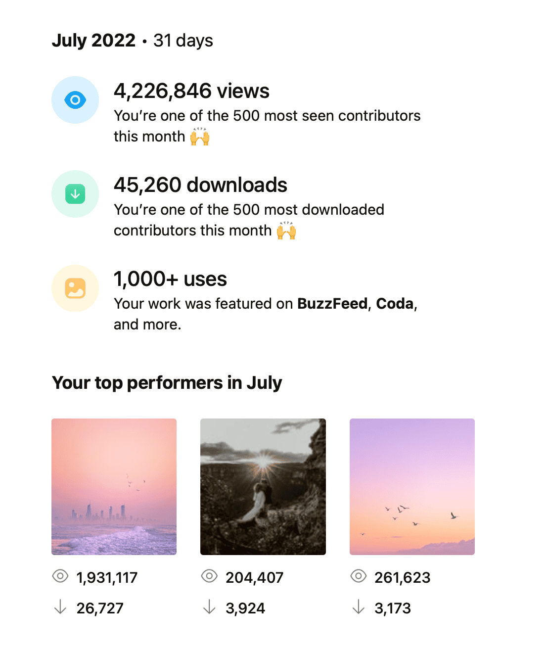 It was a good month for me on Unsplash. Zero dollars made, but millions of feel-good bucks.