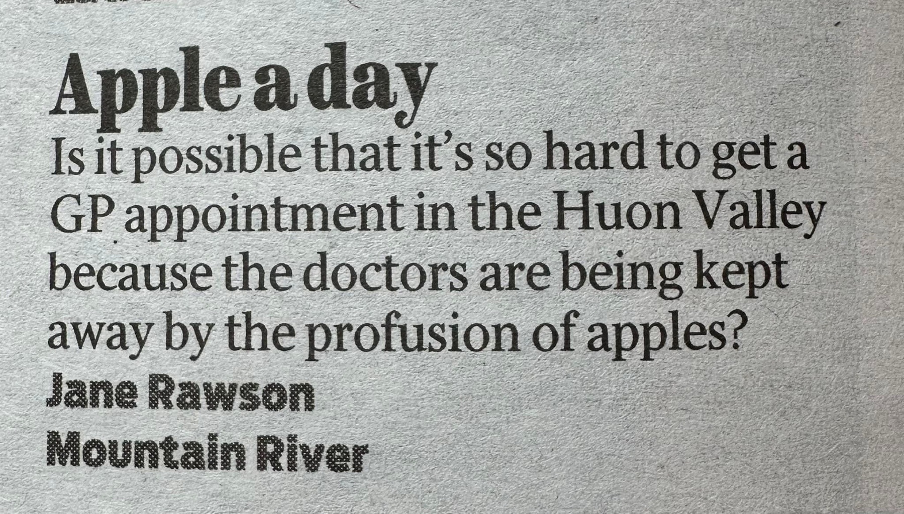 • It honestly is impossible to get a doctors appointment in the Huon Valley, I called around a few weeks ago (from today’s newspaper)