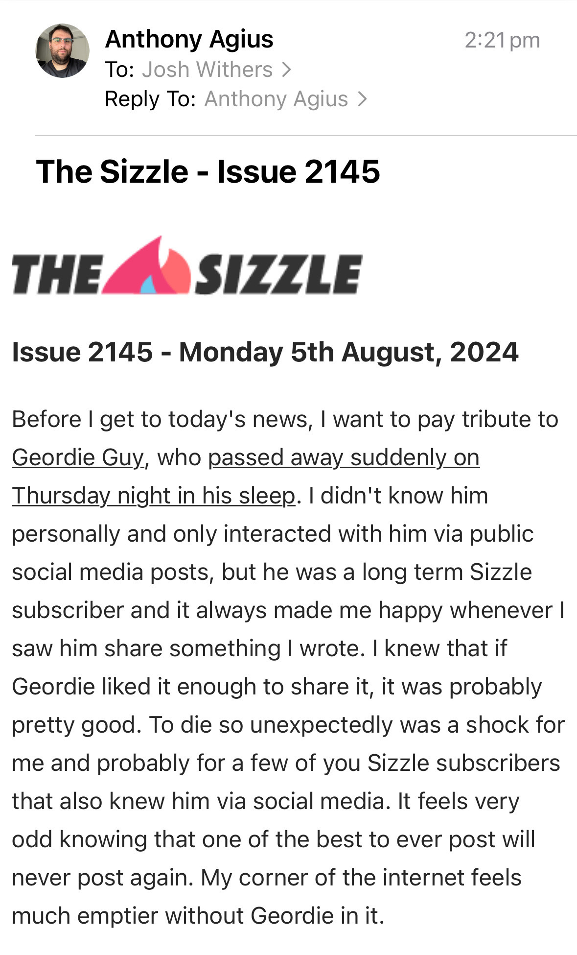 • Reading The Sizzle’s opening lines today by @decryption@aus.social really took me for a six. No day in this life is promised to us, but I’m glad to have spent today with each of you.
