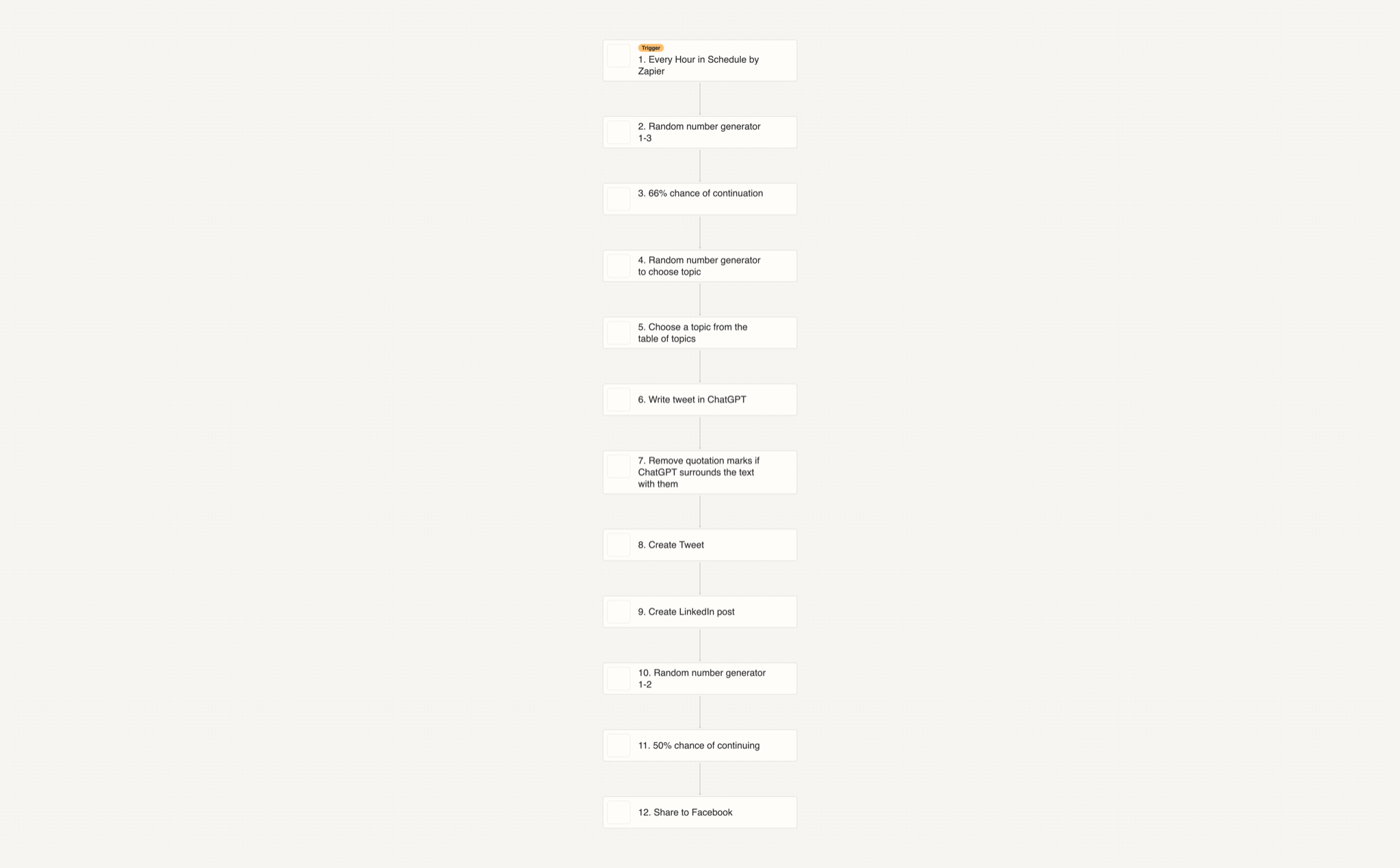 There's a 66% chance of the zap running that every hour, and 50% of the time the content goes to Facebook.